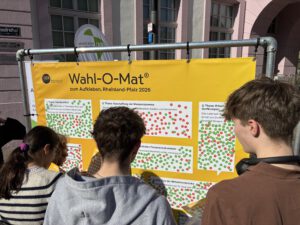 Schülerinnen und Schüler durchlaufen den Wahl-O-Mat live vor Ort in Trier Grund- und Leistungskurse der Jahrgangsstufe 11 bepunkten fleißig politische Statements der Parteien Der Besuch