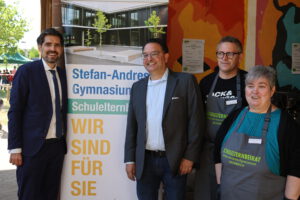 Minister Teuber mit Schulleiter Knobloch, Herrn Klären (SEB-Vorsitzender) und Frau Reuland (stellv. SEB-Vorsitzende)
